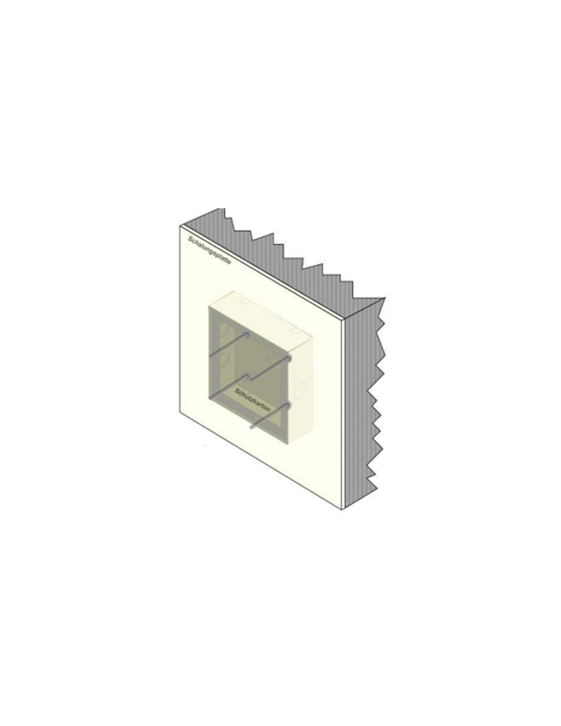 Le boîtier d’encastrement AVS (type 1 ou 2) est préparé pour une pose en béton (ailes de retenue, protections retirées, carton de protection remis en façade).